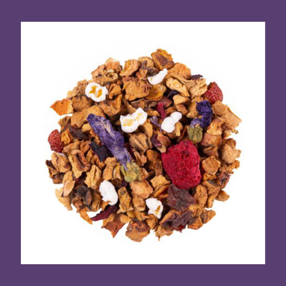 Pomme, feuilles de mûre, gingembre, bâtons de cannelle, Rooibos naturel, camomille, poivre noir, écorces d’orange, morceaux de pomme, clou de girofle, cardamome, mauve