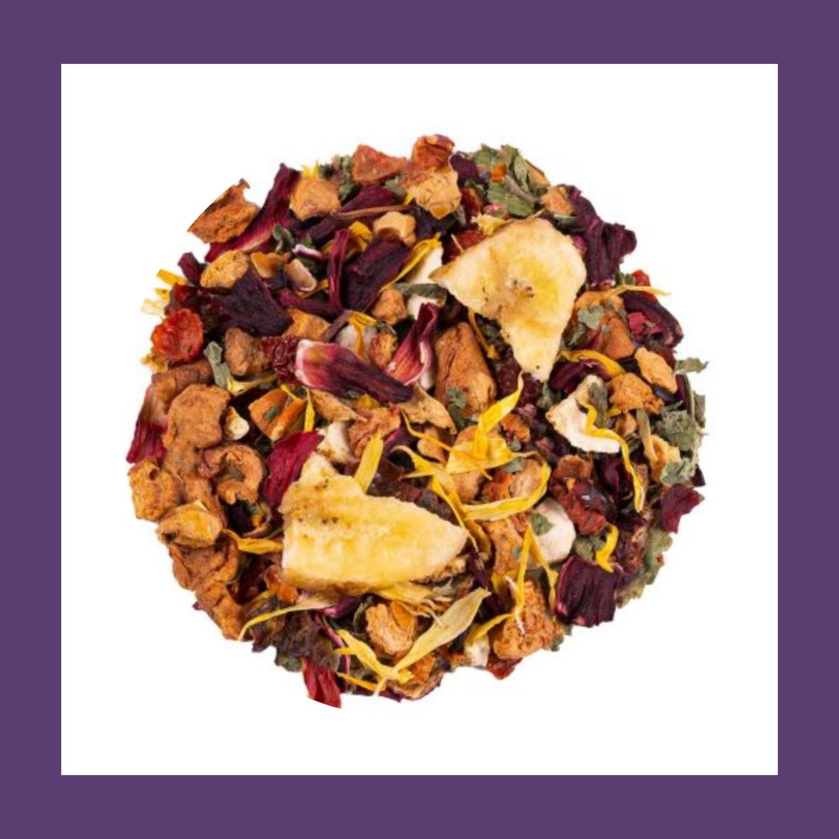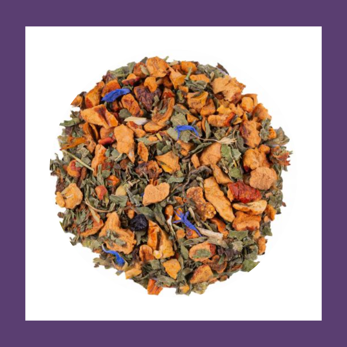 Pomme, feuilles de mûre, gingembre, bâtons de cannelle, Rooibos naturel, camomille, poivre noir, écorces d’orange, morceaux de pomme, clou de girofle, cardamome, mauve