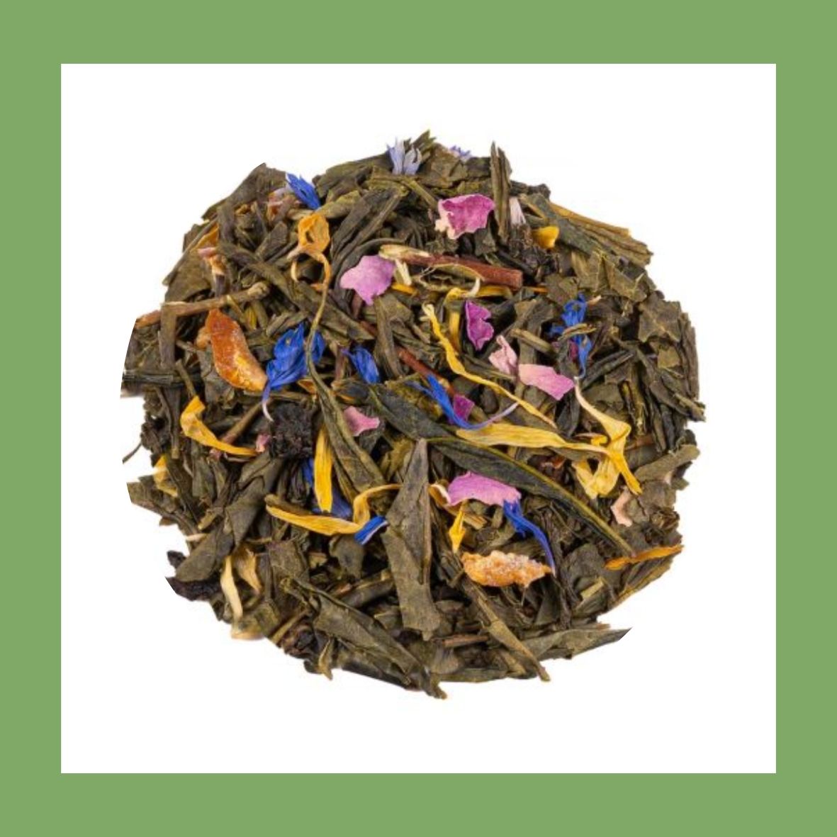 Thé vert de Chine Sencha / Maté vert / Ananas / Sucre / Feuilles d’olivier / écorce de citron / arôme naturel